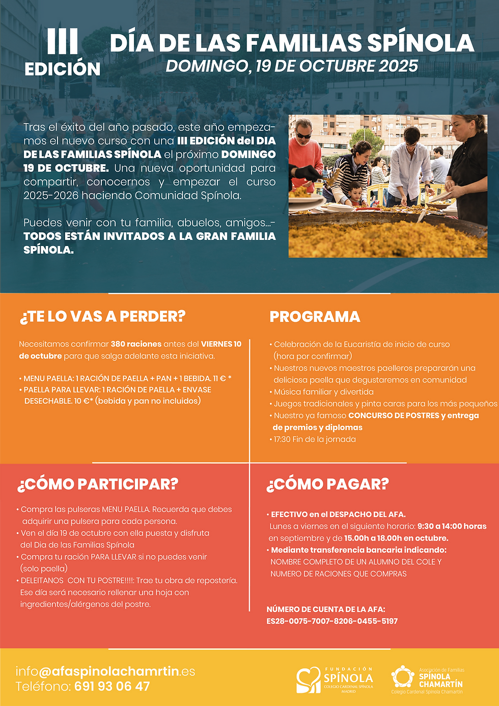 Nos alegra mucho poder compartir con vosotros la III Edición DÍA DE LAS FAMILIAS SPÍNOLA que se celebrará el próximo 19 de octubre en el colegio y que esperamos que sea una oportunidad de encuentro y disfrute para comenzar el curso. Para que salga adelante es necesario llegar a un número mínimo de raciones de paella antes del 10 de octubre. Además de juegos y pintacaras, habrá una nueva edición del famoso concurso de postres con premios a distintas categorías.